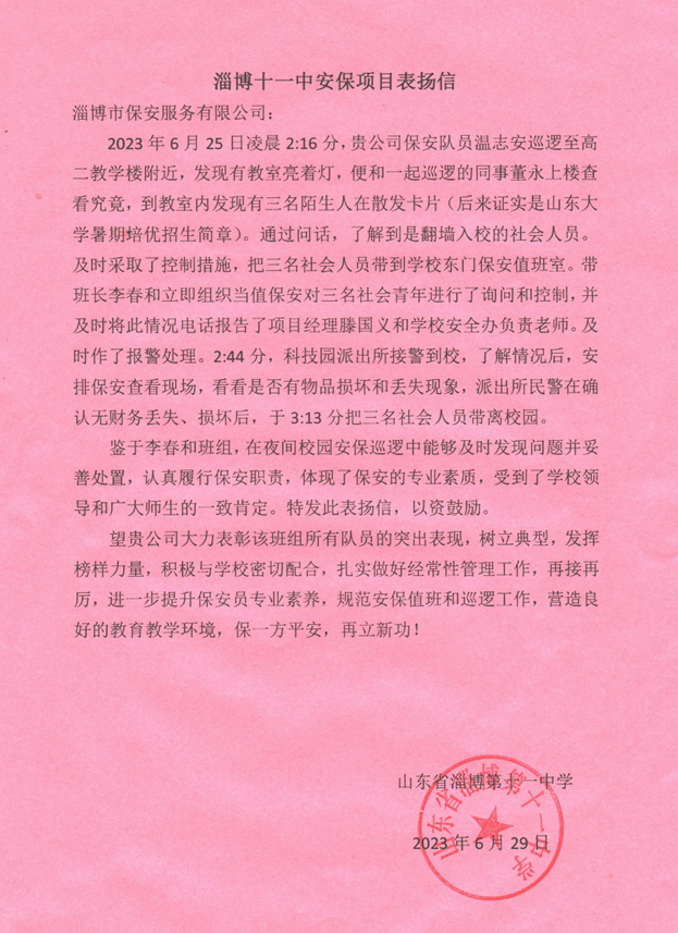 6月29日市保安公司駐淄博市第十一中學(xué)崗點收到學(xué)校送來的一封感謝信。信中對保安隊員溫志安、董永以及班長李春和項目負(fù)責(zé)人滕國義提出表揚(yáng)。